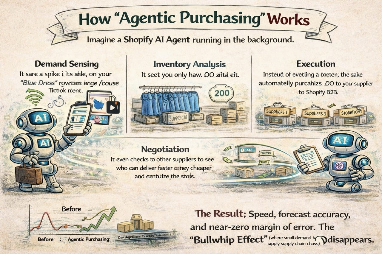 - The Execution: Instead of emailing a human, the Agent automatically generates a PO to your supplier via Shopify B2B.
