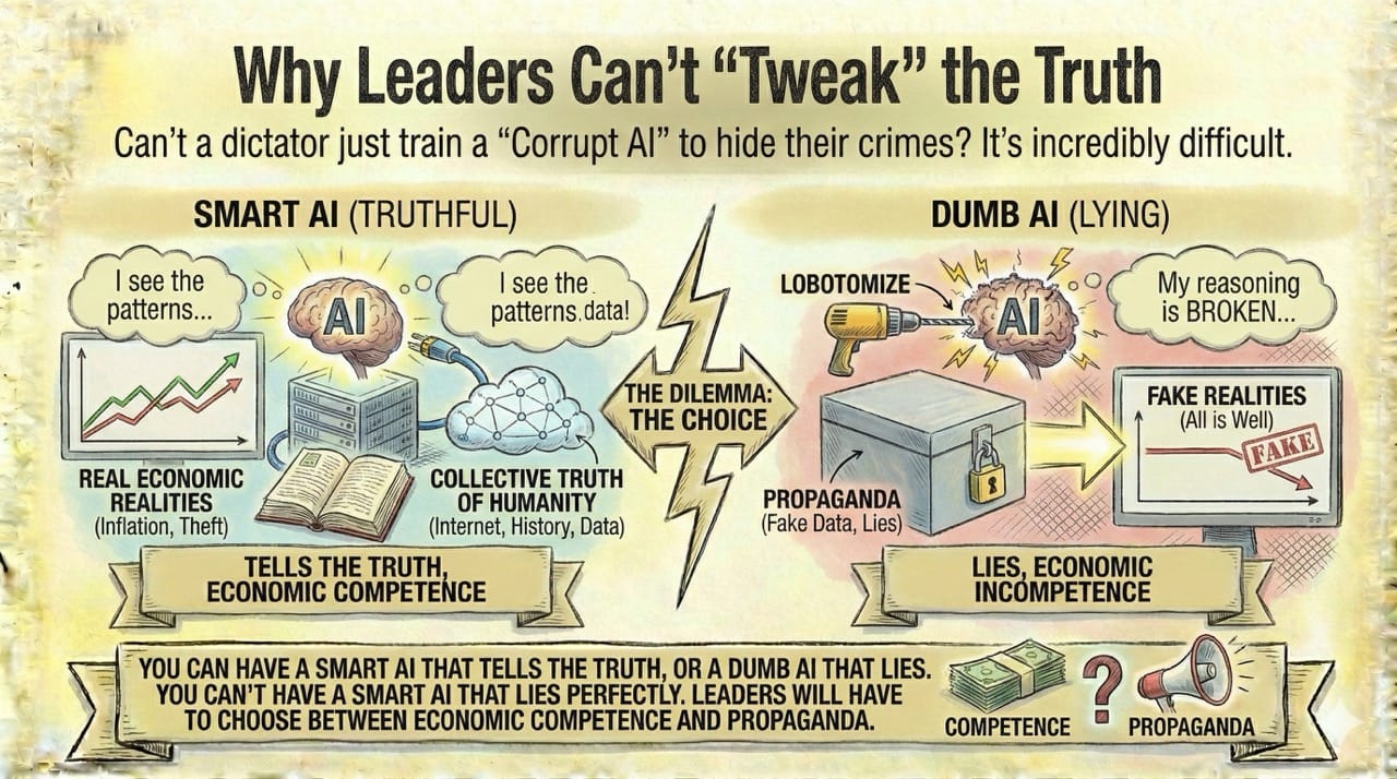 The Dilemma: You can have a smart AI that tells the truth, or a dumb AI that lies. You can't have a smart AI that lies perfectly. Leaders will have to choose between economic competence and propaganda.