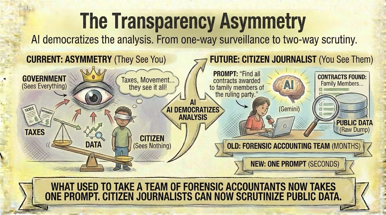 AI democratizes the analysis. A citizen journalist can take a raw dump of public data and ask Gemini: "Find all contracts awarded to family members of the ruling party."