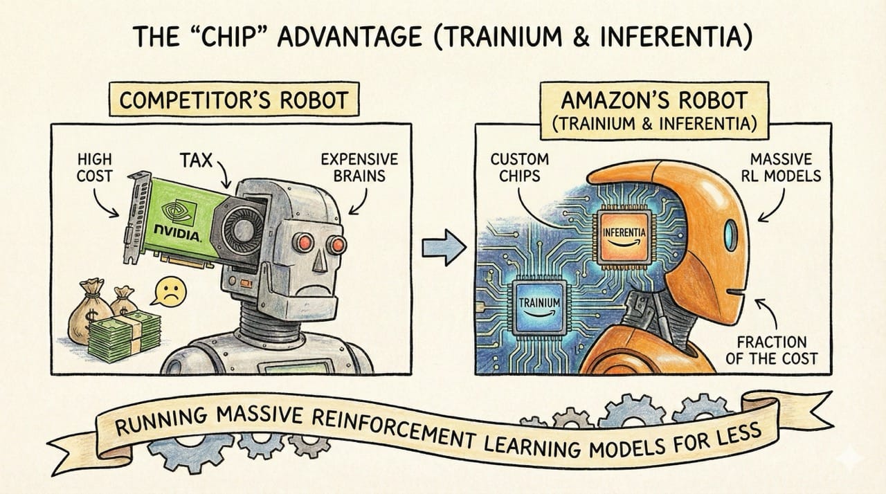 Robots need brains. Amazon builds its own custom chips: Trainium and Inferentia. They don't pay the "Nvidia Tax" for their internal workloads.
