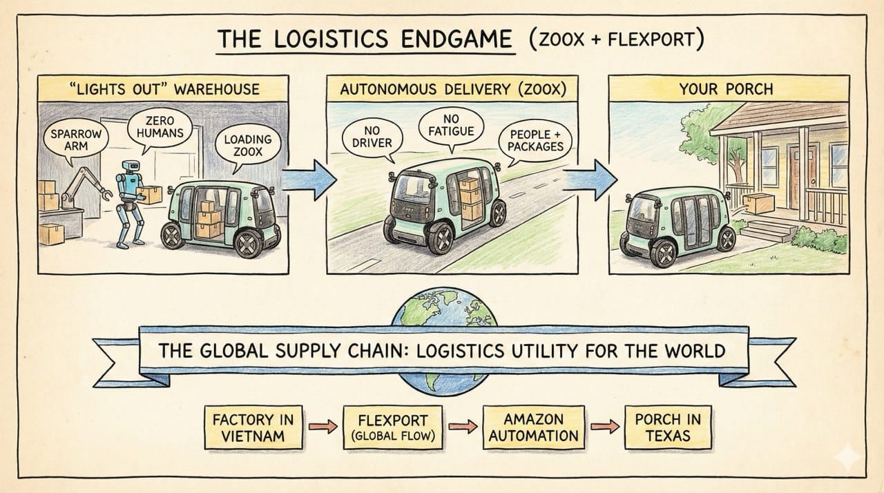 This is the checkmate. Amazon owns Zoox (autonomous robotaxis). But Zoox isn't just for people; it's for packages. Imagine a Zoox vehicle picking up goods from a "Lights Out" warehouse and delivering them to your door.