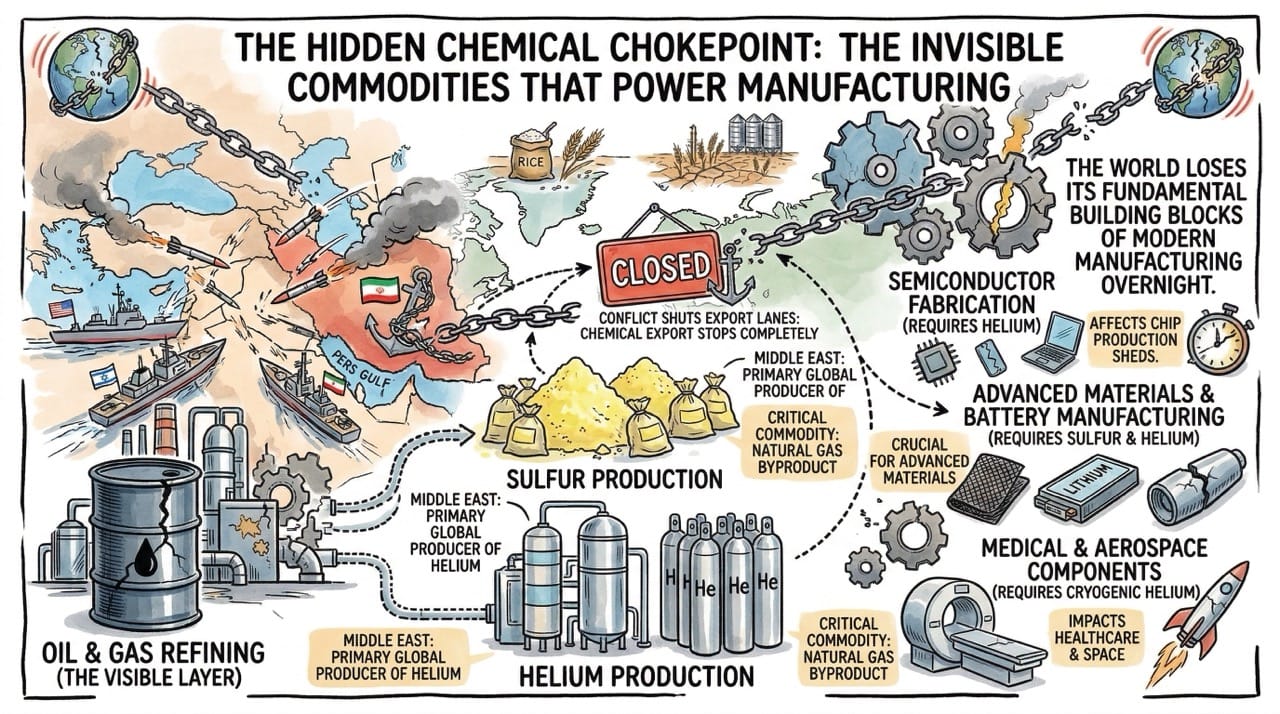 The Middle East is actually a critical supplier of invisible industrial commodities. Countries in the Gulf are primary global producers of sulfur and helium.