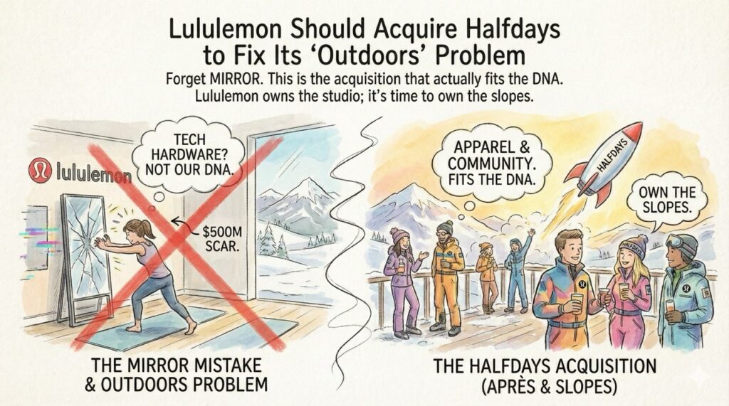D2C,Halfdays,Lululemon,Markets / January 10, 2026 / By : Barbaros Lululemon Should Acquire Halfdays to Fix Its “Outdoors” Problem Forget MIRROR. This is the acquisition that actually fits the DNA. Lululemon owns the studio; it’s time to own the slopes. Inspiration: Seeing a sea of Halfdays suits in Aspen and realizing Lululemon is completely missing the […]