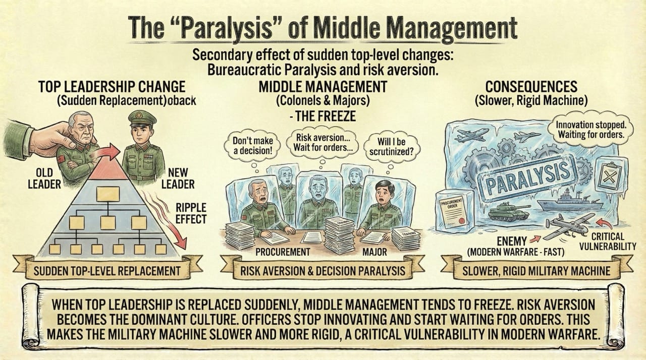 When top leadership is replaced suddenly, the middle management (Colonels and Majors) tends to freeze. No one wants to make a decision, sign a procurement order, or approve a training exercise that might be scrutinized later.