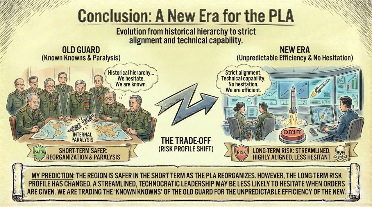 The "Strategic Pause": The PLA is likely entering a phase of internal reorganization. For the next 12 to 18 months, the focus will be on solidifying the new leadership hierarchy rather than external expansion. You cannot launch the most complex amphibious invasion in history while you are auditing your own general staff.