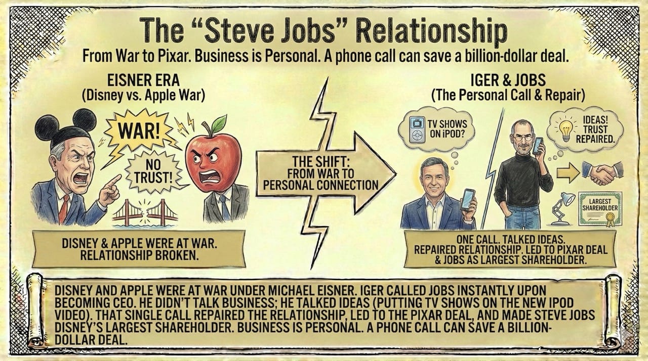That single call repaired the relationship, led to the Pixar deal, and made Steve Jobs Disney’s largest shareholder. Business is personal. A phone call can save a billion-dollar deal.