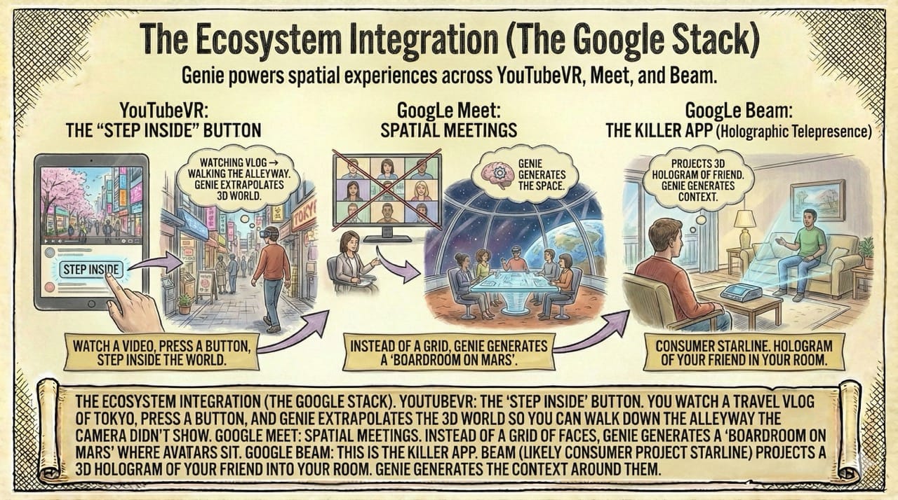 YouTubeVR: The "Step Inside" button. You watch a travel vlog of Tokyo, press a button, and Genie extrapolates the 3D world so you can walk down the alleyway the camera didn't show.