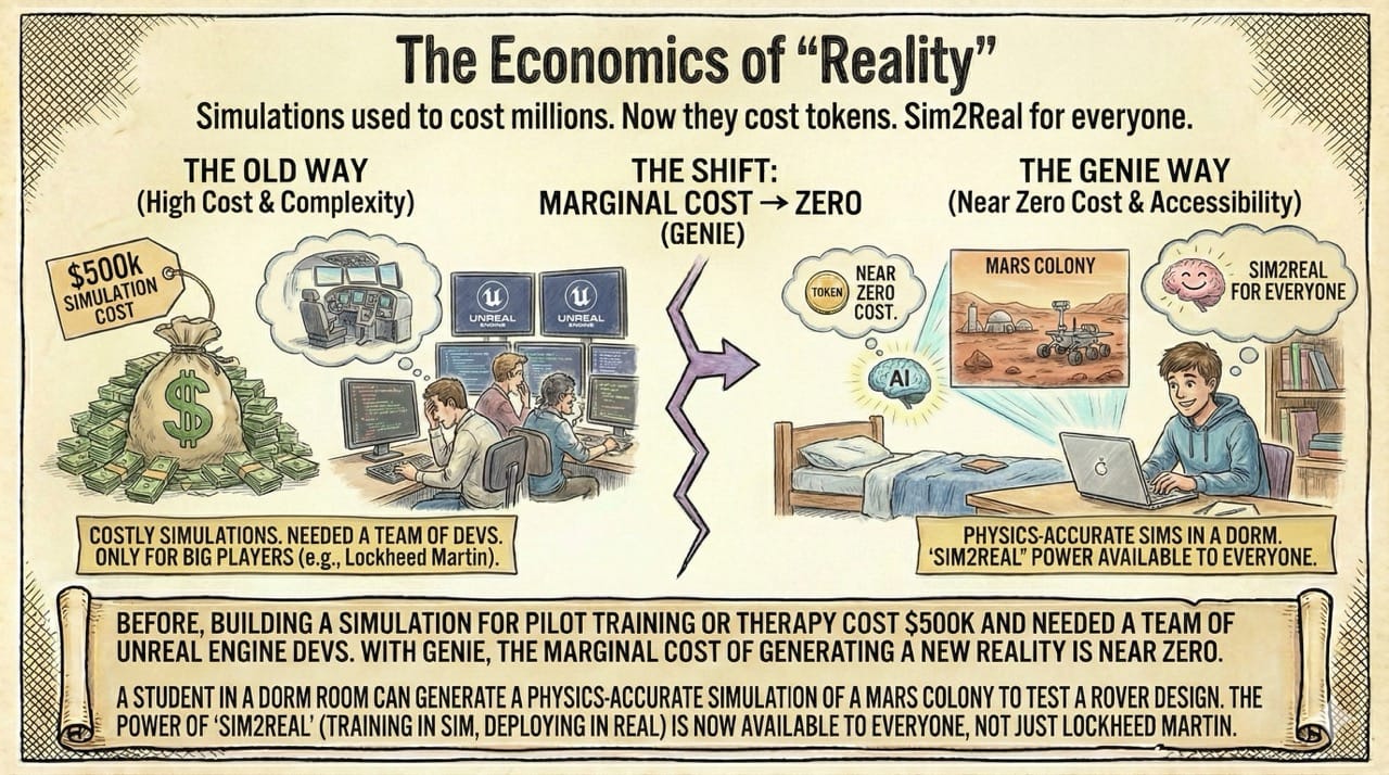 Real Estate: Why look at 2D photos? You feed Genie the blueprints of a house that doesn't exist yet. You put on a headset and walk through it. You change the sun angle. You verify the view. It kills "Buyer's Remorse."