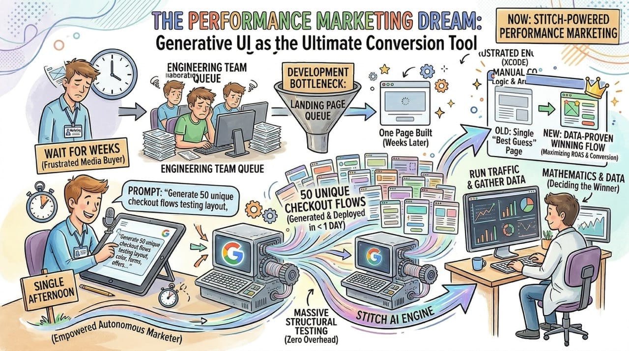 Stitch allows a marketer to autonomously generate and deploy fifty completely unique checkout flows in a single afternoon.