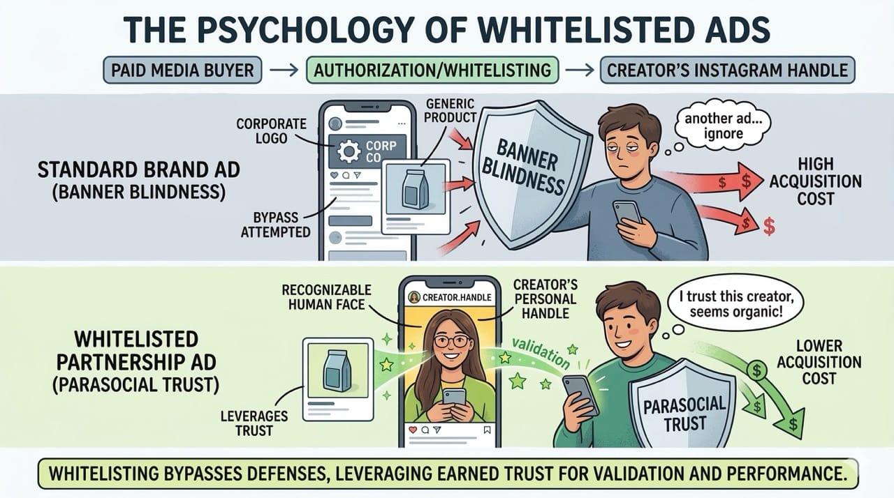 A whitelisted partnership ad occurs when a brand runs paid media directly through a creator's personal Instagram handle. Instead of seeing a corporate logo in their feed, the user sees an ad coming from a recognizable human face.