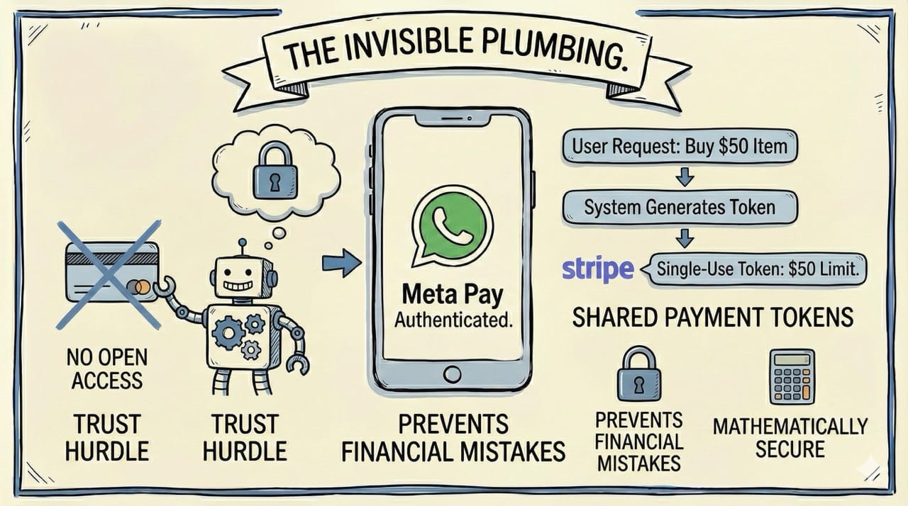 The industry is solving this with Shared Payment Tokens engineered by companies like Stripe.