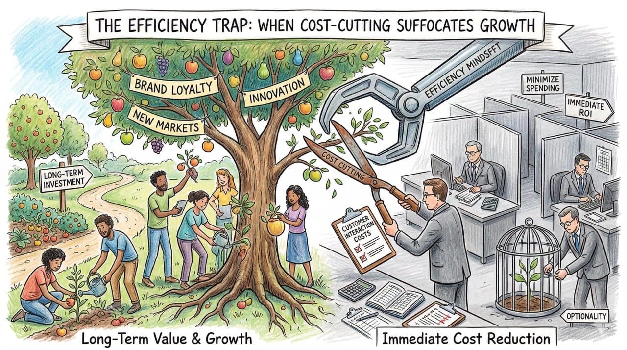 Inspiration: Analyzing a fascinating discussion with Rory Sutherland regarding the fatal conflict between the opportunity mindset of marketing and the efficiency mindset of finance. Realizing that the relentless pursuit of cost reduction is quietly destroying the most valuable optionality in our businesses and personal lives.