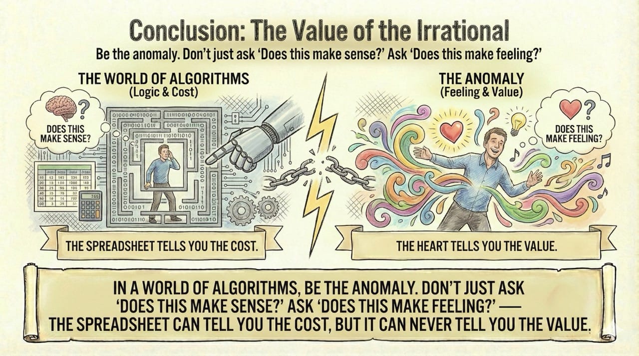 My Lesson: Don't just ask "Does this make sense?" Ask "Does this make feeling?" The spreadsheet can tell you the cost, but it can never tell you the value.