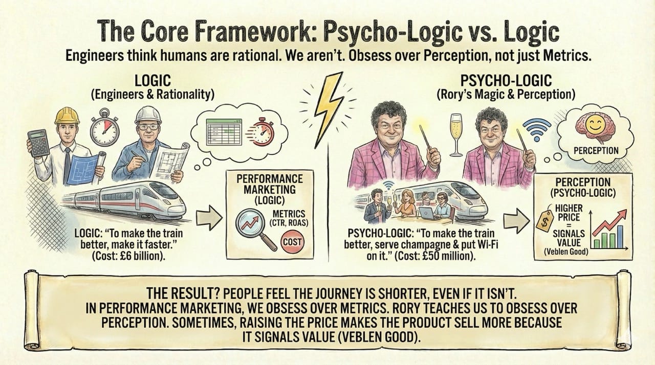 In performance marketing, we obsess over metrics. Rory teaches us to obsess over Perception. Sometimes, raising the price makes the product sell more because it signals value (Veblen Good).