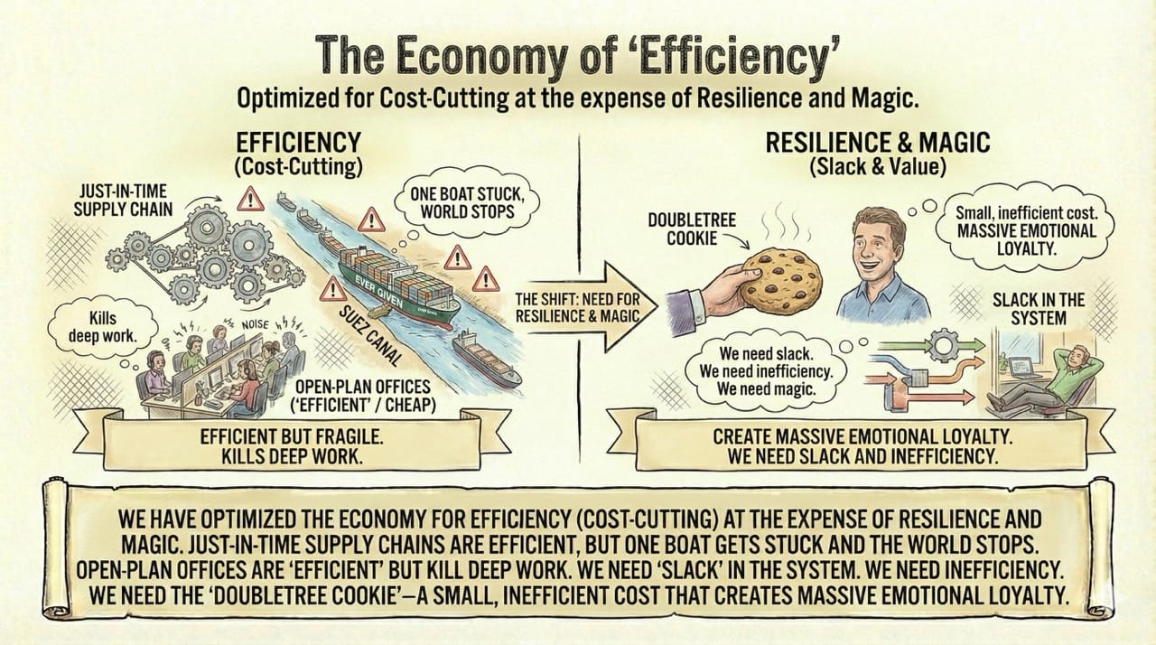 We need "slack" in the system. We need inefficiency. We need the "DoubleTree Cookie"—a small, inefficient cost that creates massive emotional loyalty.