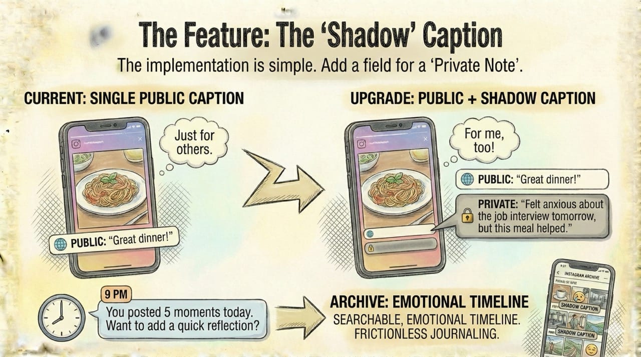Instagram Stories are already a diary. We just need a "Shadow Caption" to turn them from performance into reflection.