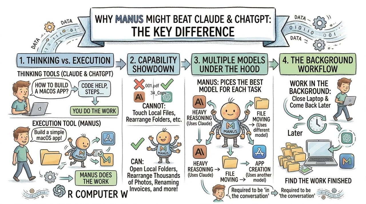 Claude and ChatGPT require you to be in the conversation. Manus does not. That alone is a huge shift.