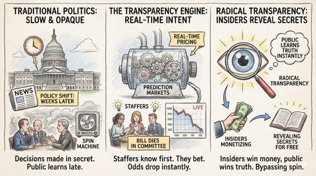 If a bill is going to die in committee, the staffers know first. They bet. The odds drop. The public learns the truth instantly, bypassing the spin.