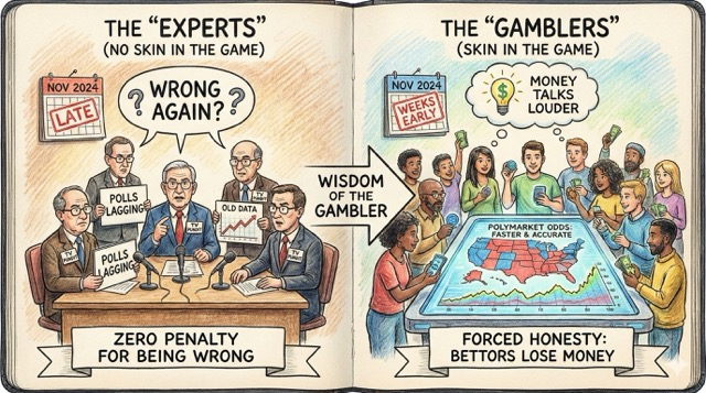 Why? Because participants have “skin in the game.” An expert can be wrong on TV with zero penalty. A bettor loses money. This forces honesty.