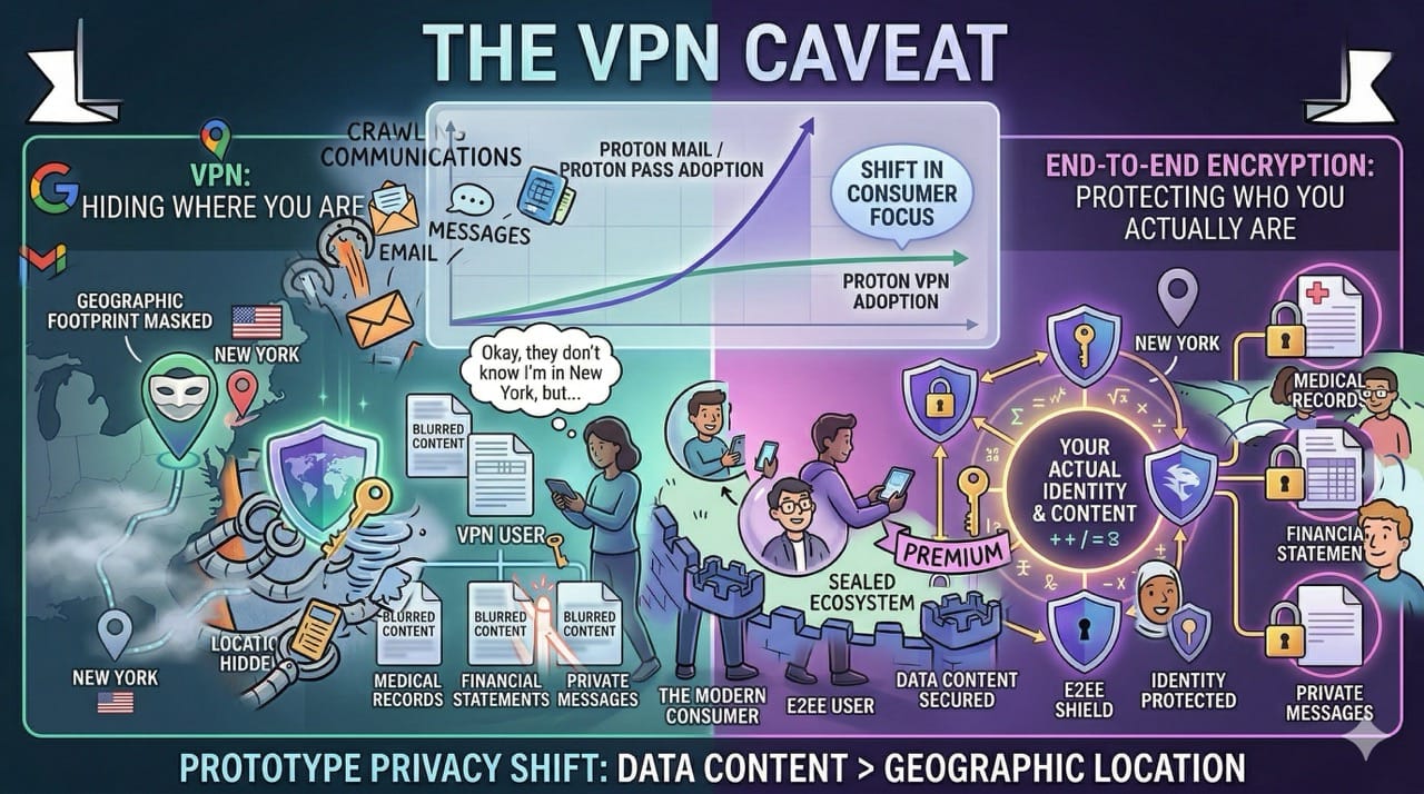 A VPN hides where you are, but end-to-end encryption protects who you actually are.