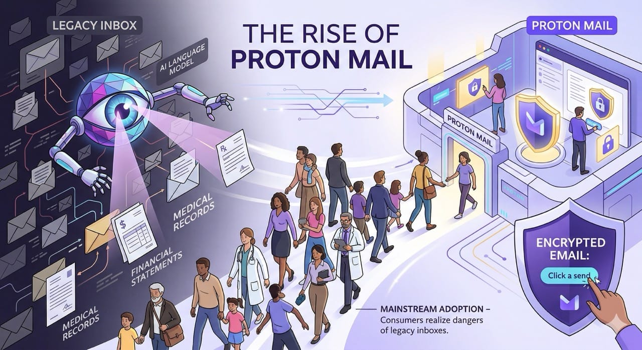 Proton Mail will experience a massive surge in mainstream adoption as consumers realize their legacy inboxes are actively being crawled by language models.