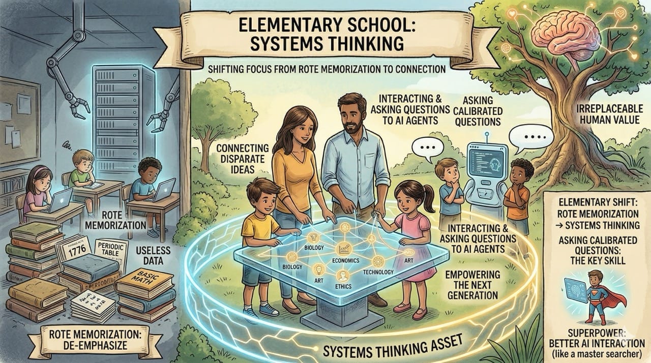 As children enter elementary school, the focus must shift toward foundational systems thinking. Rote memorization is completely useless when a machine holds the entirety of human knowledge on a server.