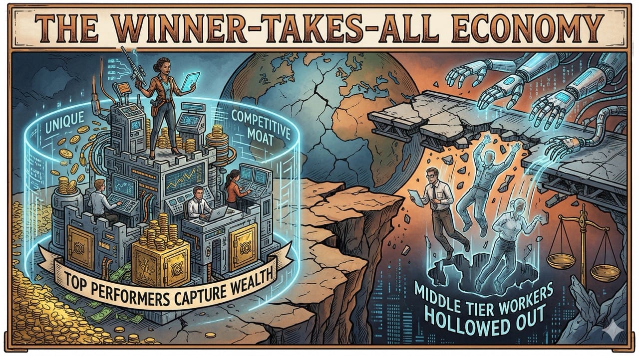 Top performers who possess unique competitive moats will capture almost all of the available wealth, while the middle tier of workers will be completely hollowed out by algorithms.
