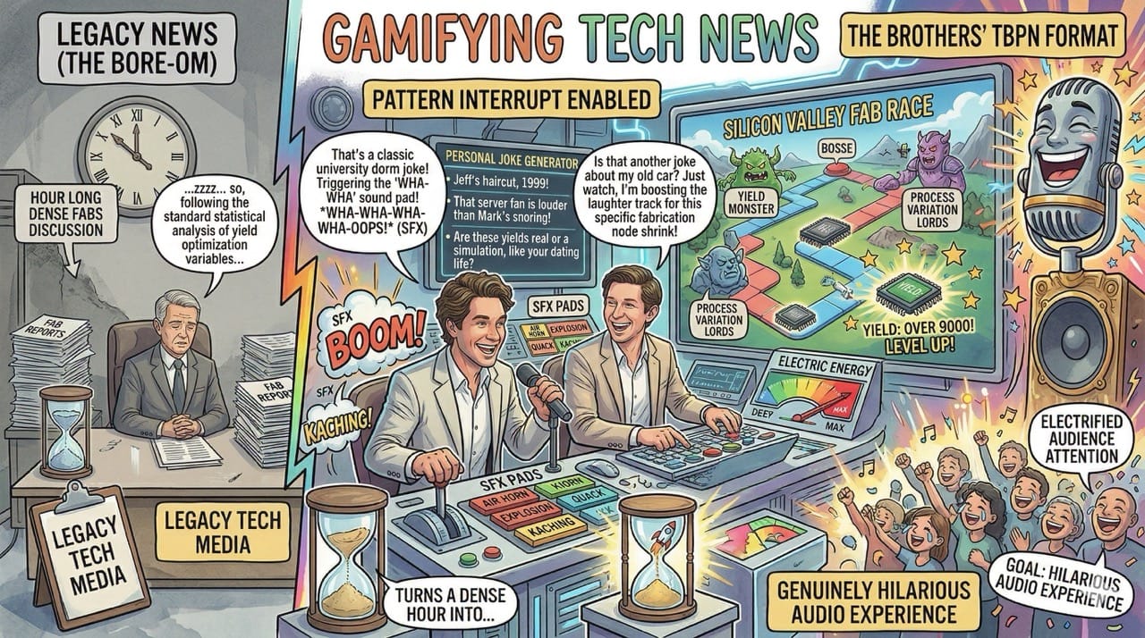 This specific production style turns a dense, hour long discussion about semiconductor yields into a genuinely hilarious audio experience.