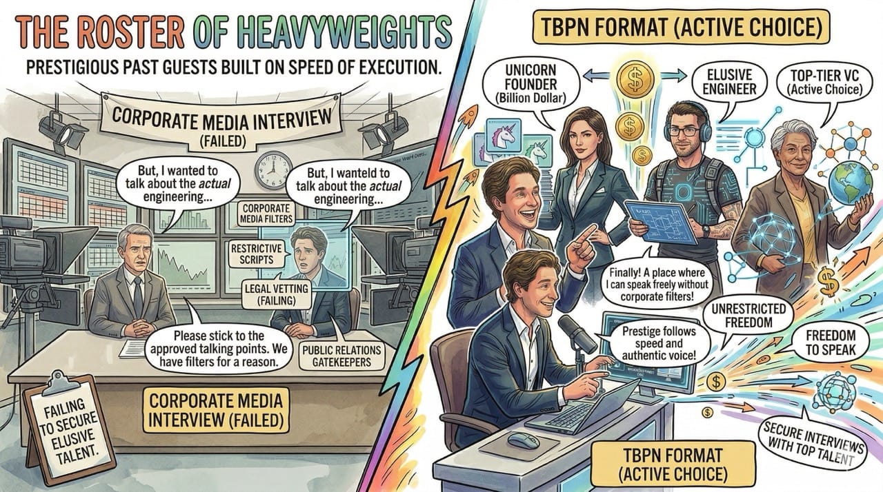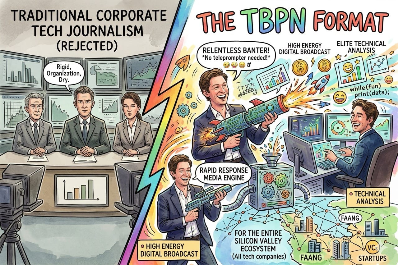 TBPN moves with the absolute velocity of a lean startup to capture trending personalities immediately.