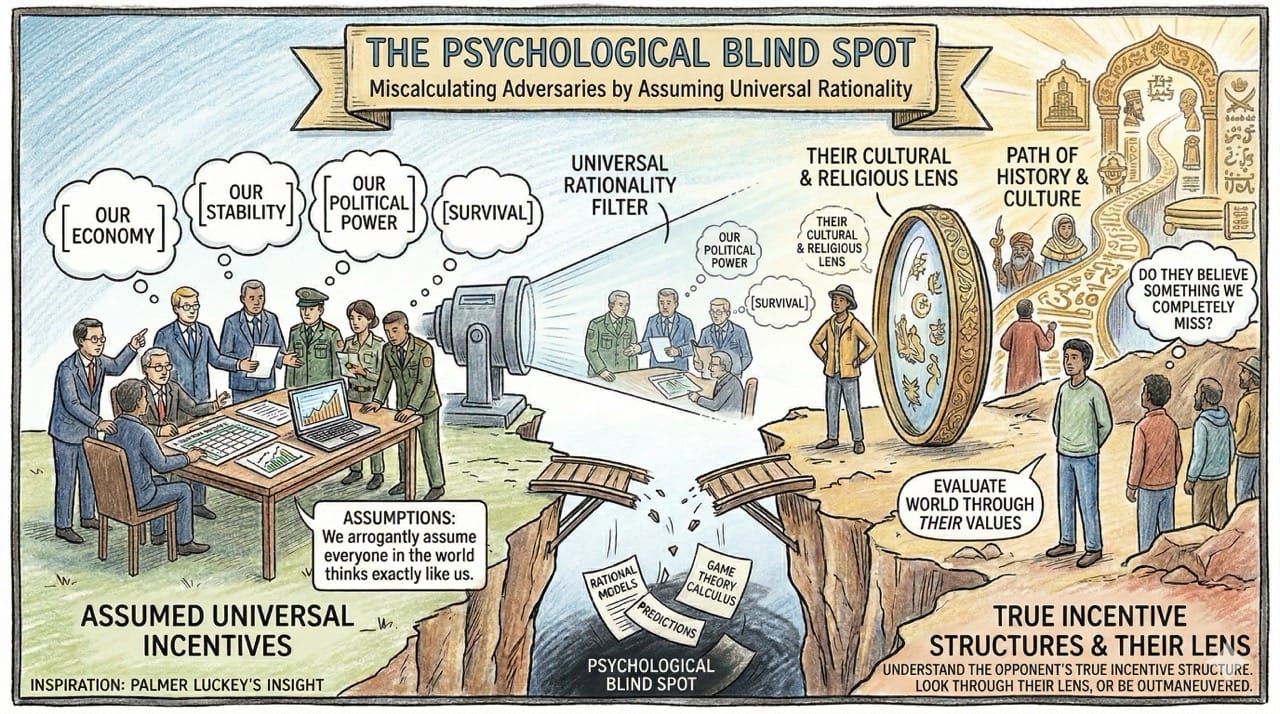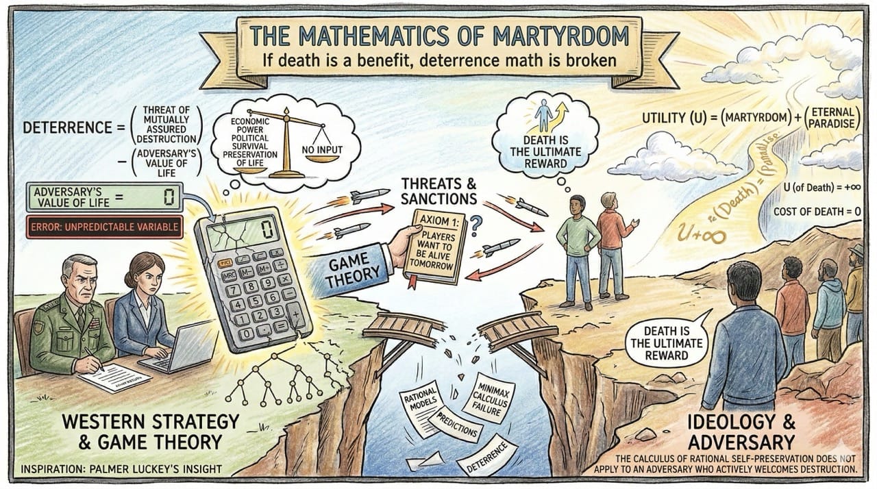 Inspiration: Palmer Luckey's interview on the TBPN podcast. He explained why it is nearly impossible for the West to navigate the Middle East using standard game theory when the adversary believes martyrdom promises a better life.