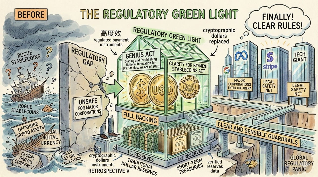 Fast forward to today, and the regulatory environment has completely transformed. Legislation like the GENIUS Act and the Clarity for Payment Stablecoins Act established clear and sensible guardrails.