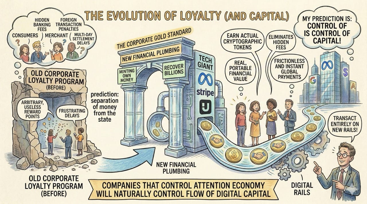 Inspiration: Reading an old analyst report predicting the rise of corporate currencies, and suddenly seeing it validate in real time with Meta's new announcements and Stripe's latest payment data.