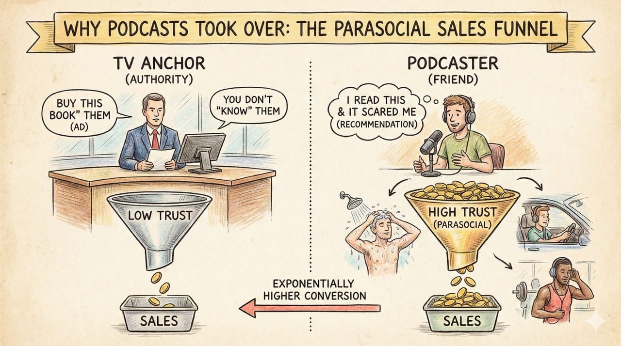 The Conversion Rate: The conversion rate from a podcast recommendation is exponentially higher than TV because the Trust is higher.