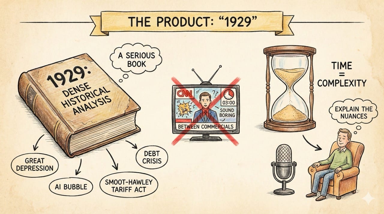 First, the book. 1929 is a dense, historical analysis of the Great Depression, drawing parallels to the AI Bubble and the Debt Crisis of today.