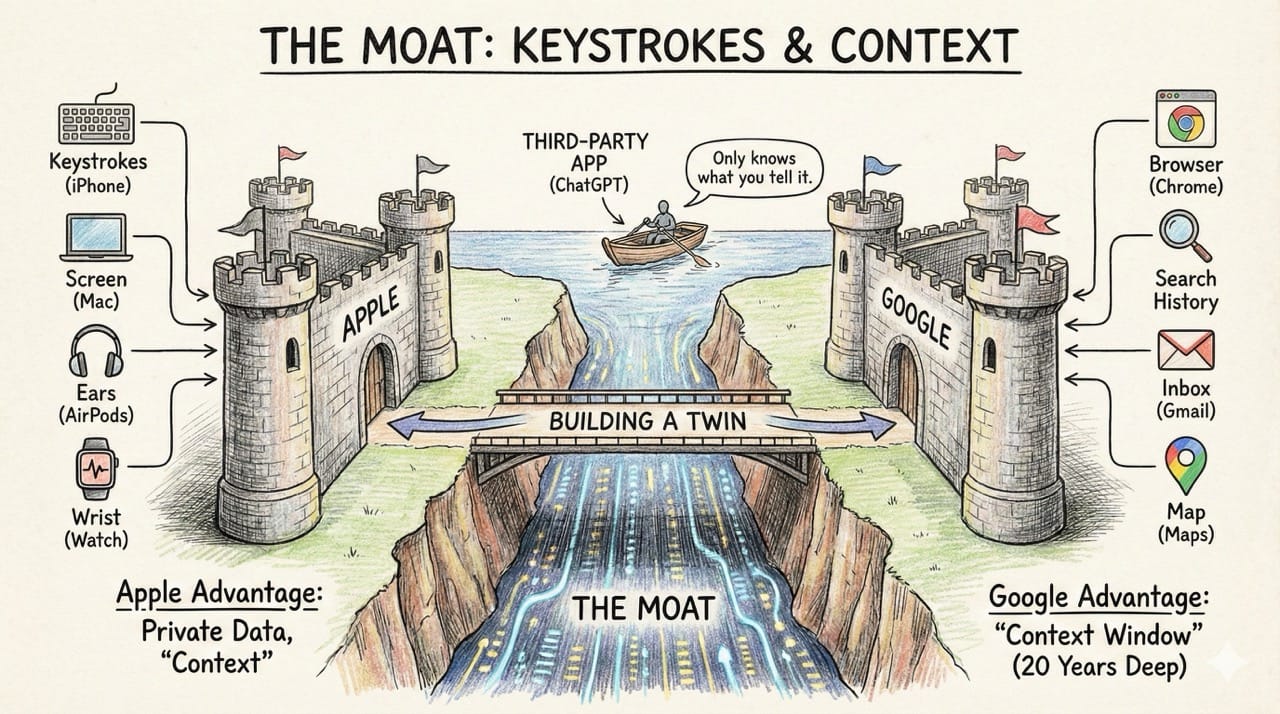 ChatGPT is smart, but it doesn't know you. Apple and Google own your keystrokes, your location, and your memories. They are building the "Digital Twin" that will make every other AI look like a toy.