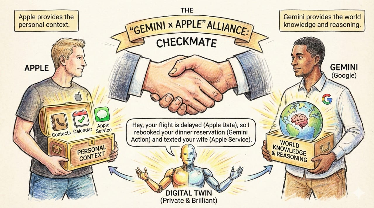 The Result: A Digital Twin that is both private and brilliant. It can say, "Hey, your flight is delayed (Apple Data), so I rebooked your dinner reservation (Gemini Action) and texted your wife (Apple Service)."