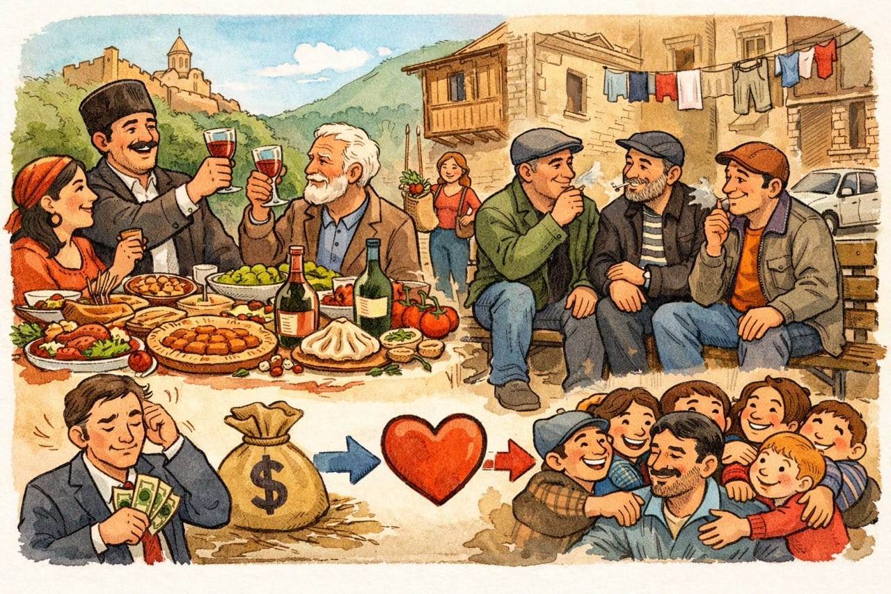 To me, sitting on a street corner smoking for 3 hours is "wasting time." But they are investing in Social Capital. In a crisis, an American has money but no friends. A Georgian might have no money, but 50 cousins who will show up to help. Who is actually richer?