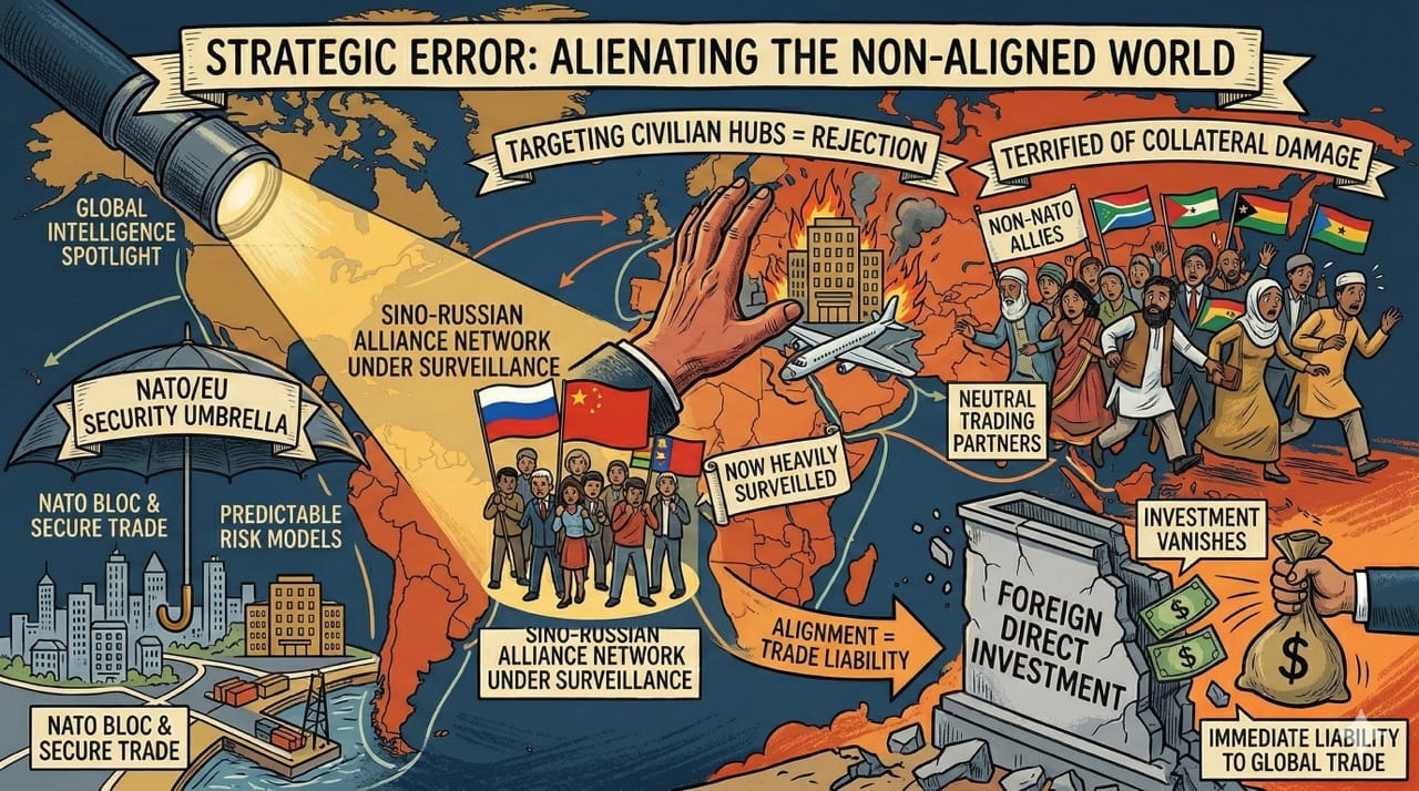 If a nation aligns with a bloc that bombs hotels, they become an immediate liability to global trade. Foreign direct investment will simply vanish from those regions.