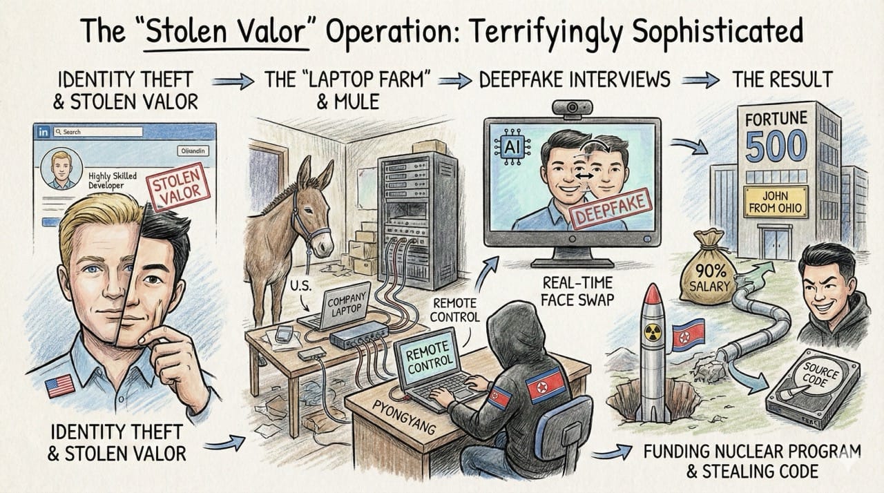 The Result: A Fortune 500 company thinks they hired "John from Ohio." They actually hired a DPRK operative who sends 90% of his salary to fund a nuclear weapons program and uses his access to steal source code.