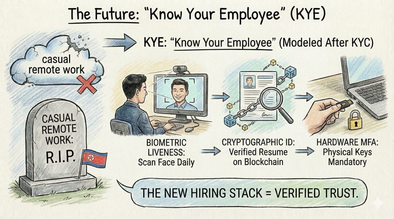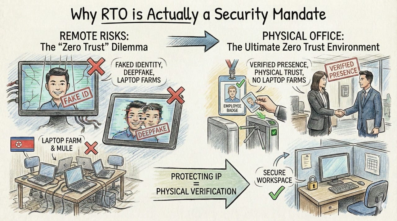 We thought Return-to-Office mandates were about "collaboration." They aren't. They are about security. Nation-state actors have weaponized remote hiring, forcing companies to retreat to the only place where identity is guaranteed: The Office.