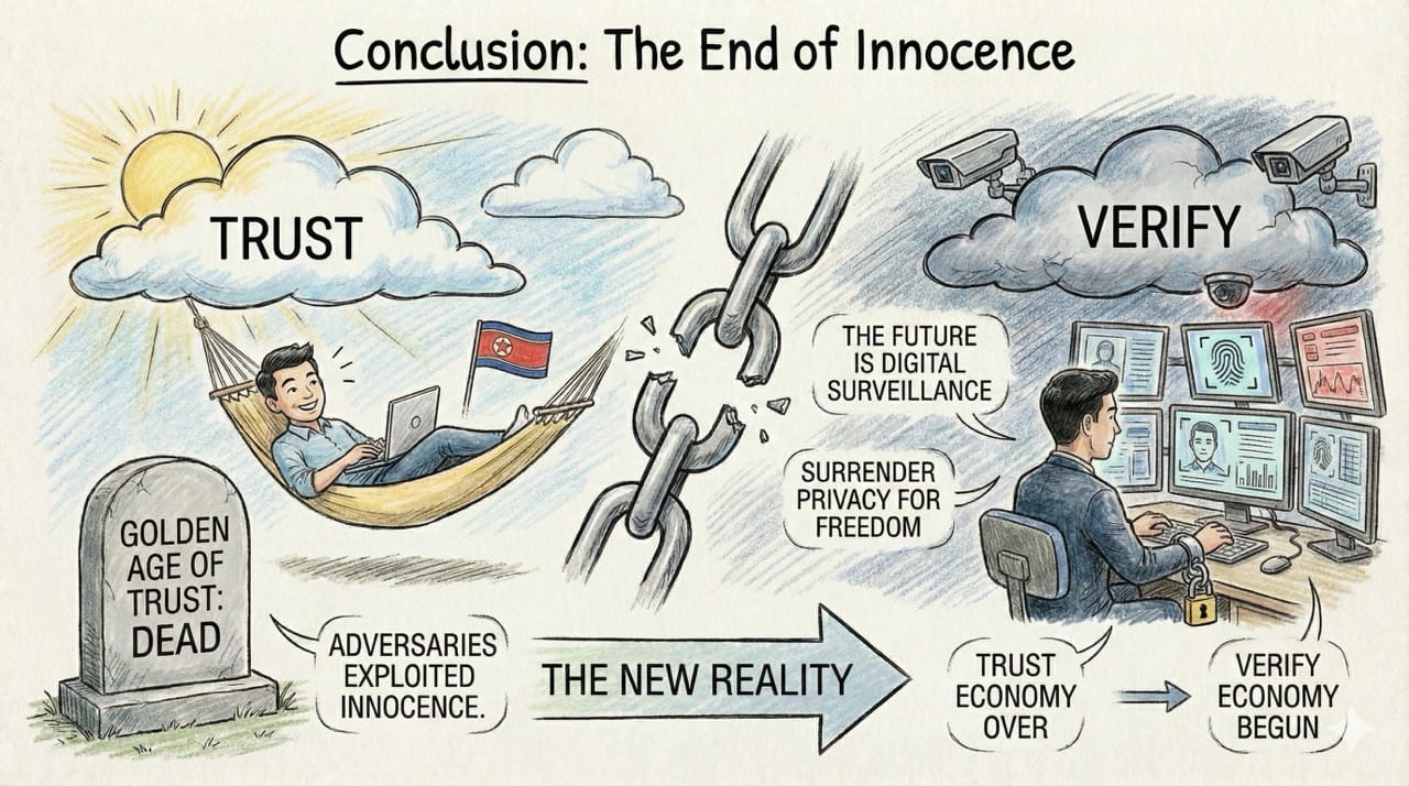 Inspiration: Reading the DOJ indictments about North Korean IT workers infiltrating Fortune 500 companies, and realizing that the "Trust" required for remote work has been permanently shattered.