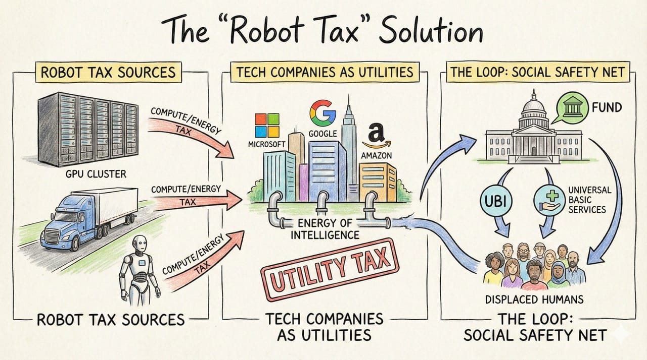 - The Loop: This tax revenue funds the social safety net (UBI or Universal Basic Services) for the displaced humans.