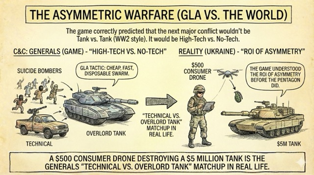 Look at Ukraine. A $500 consumer drone destroying a $5 million tank is the Generals “Technical vs. Overlord Tank” matchup in real life. The game understood the ROI of Asymmetry before the Pentagon did.