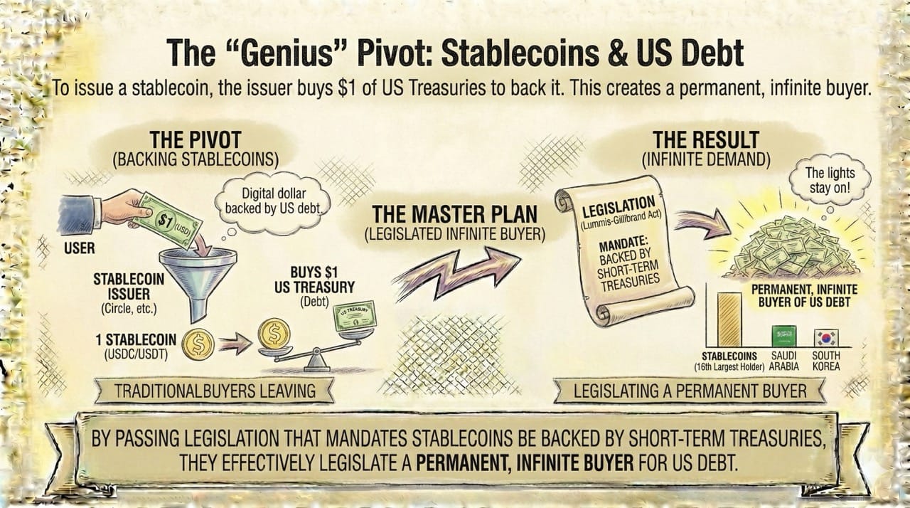 Politicians realized this. By passing legislation (like the Lummis-Gillibrand act) that mandates stablecoins be backed by short-term Treasuries, they effectively legislate a permanent, infinite buyer for US debt.