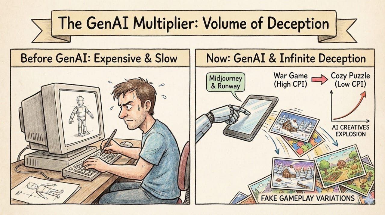 GenAI dropped the cost of lying to zero. Mobile games are flooding Meta with "cozy" ads for "hardcore" games. It lowers the Cost Per Install, but it breaks the user's trust in the entire ecosystem.