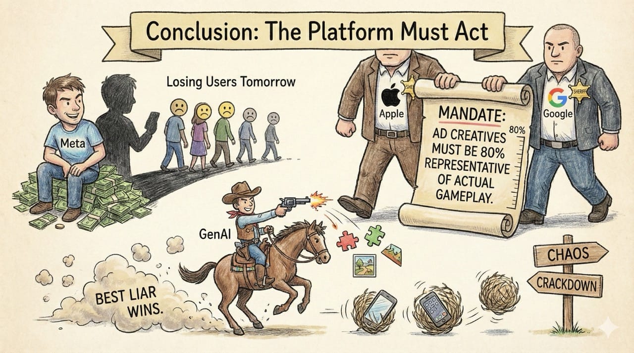My Prediction: We will see a crackdown. Apple or Google (the App Stores) will eventually mandate that "Ad Creatives must be 80% representative of actual gameplay." Until then, GenAI has turned mobile marketing into a Wild West where the best liar wins.