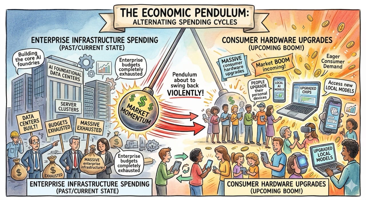 The macroeconomic cycle always alternates between heavy enterprise infrastructure spending and massive consumer hardware upgrades.