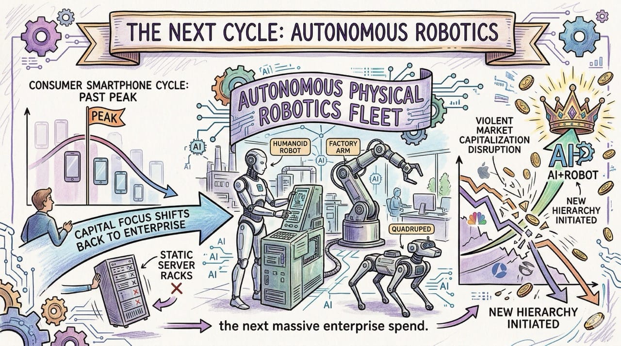 The market capitalization crown is currently passing from Nvidia to Apple and Google. Understanding this macroeconomic cycle is the key to predicting the upcoming physical robotics boom.