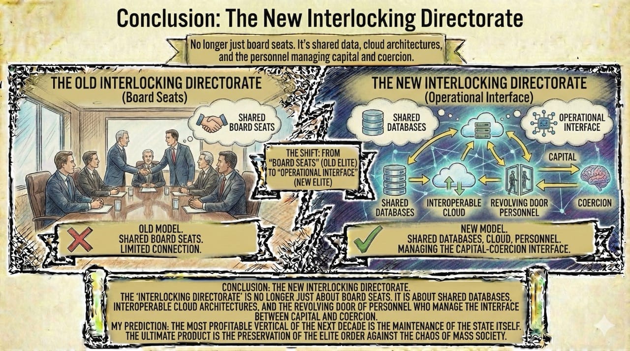 The "Interlocking Directorate" is no longer just about board seats. It is about shared databases, interoperable cloud architectures, and the revolving door of personnel who manage the interface between capital and coercion.