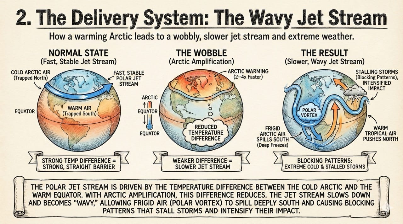 The Wobble: The Arctic is warming 2–4 times faster than the rest of the planet (Arctic Amplification). This reduces the temperature difference.